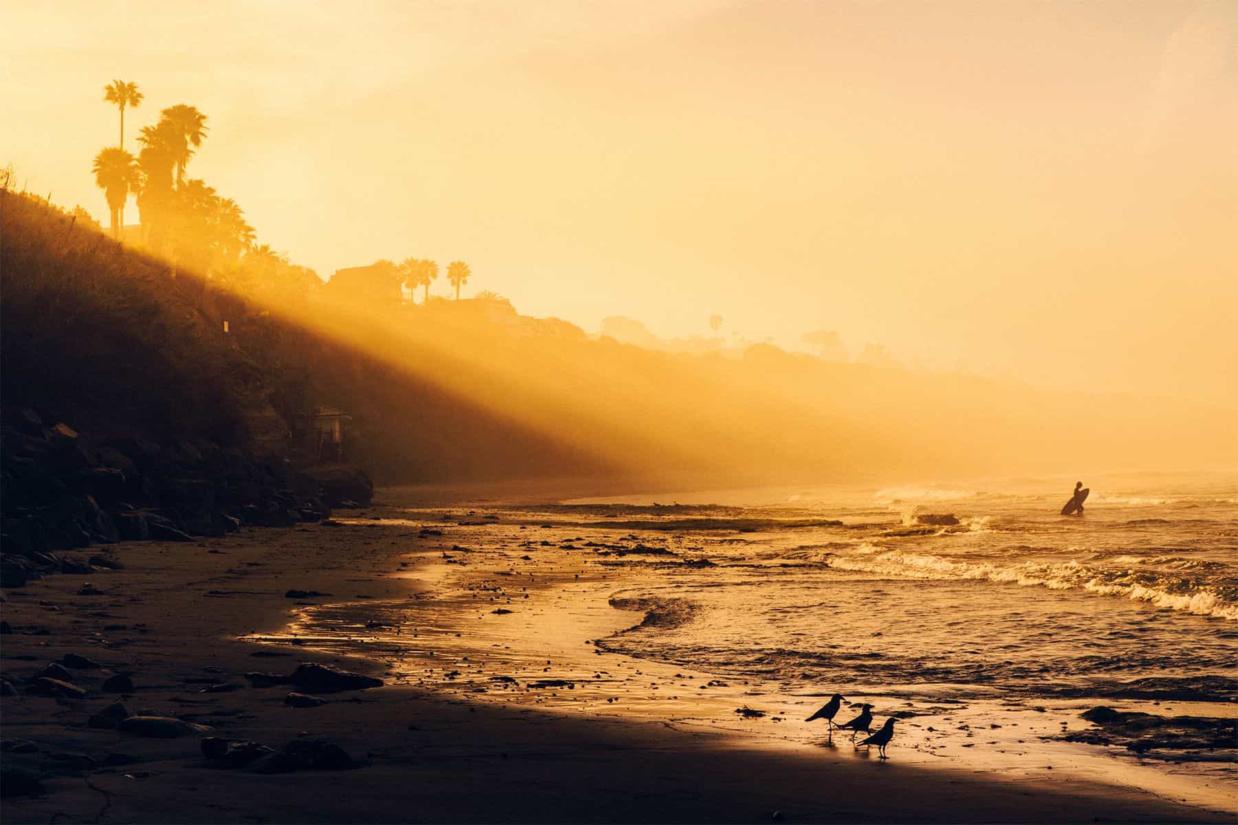 I’d been to LA, Malibu and further north before so I had some familiarity with those areas. Further south I had less of an idea of what to expect. Huntington was a little seedier than I expected, once you got a block back from the beach, but I liked that edginess and contrast. I was quite surprised at how LA and Long Beach loomed on the horizon along with what looked like oil platforms. As the light faded and those city lights came on it was quite a sight. Encinitas was pretty much the perfect cliché of a California surf town with cool cafes and surf shops, an old movie theatre and sun bleached everything; Hippies playing music on the green above Swamis. I loved seeing that.