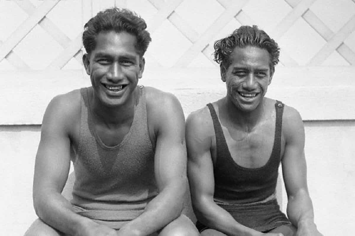 Duke Paoa Kahinu Mokoe Hulikohola Kahanamoku was born in Honolulu in 1890 and was the eldest of nine children born to Duke Halapu and Julia Paoa Kahanamoku. His father had been named in honor of the visit of the Duke of Edinburgh to Hawaii in 1869, and Duke shared this name although his family called him by his middle name, Paoa. A true Hawaiian, Duke was a natural waterman and excelled as a swimmer, bodysurfer, surfer, diver and paddler, often riding longer than average surfboards to allow him to paddle further out and catch larger waves and get longer rides. In 1911, aged just twenty-one, he left the Outrigger Canoe Club to form the Hui Nalu Club with two friends, and then in the summer he entered a swimming contest in Honolulu Harbor; Duke’s prowess as a swimmer was well known locally, but beating the world record for the 100 yards freestyle by 4.6 seconds suddenly thrust him onto a much larger stage. He travelled to the US Olympic trials a year later and broke the 200m freestyle world record, before winning a gold and silver medal for the 100m freestyle and 200m freestyle relay at the 1912 Stockholm Olympic Games. He competed in three more Olympic games in a competitive career spanning twenty years. On his way home from the 1912 Stockholm Olympics he stopped off at Atlantic City in New Jersey to give swimming exhibitions, and introduced surfing to the East Coast of America. Duke’s fame as a record-breaking swimmer saw him travelling widely to compete and give swimming exhibitions, and he often included surfing demonstrations in these visits. In 1914 he travelled to Australasia and on December 24th gave a surfing exhibition at Freshwater Beach in Sydney on a surfboard that he shaped himself using local timber, a moment regarded by many to be the dawn of Australian surfing. In 1915 he then re-introduced surfing to New Zealand.
