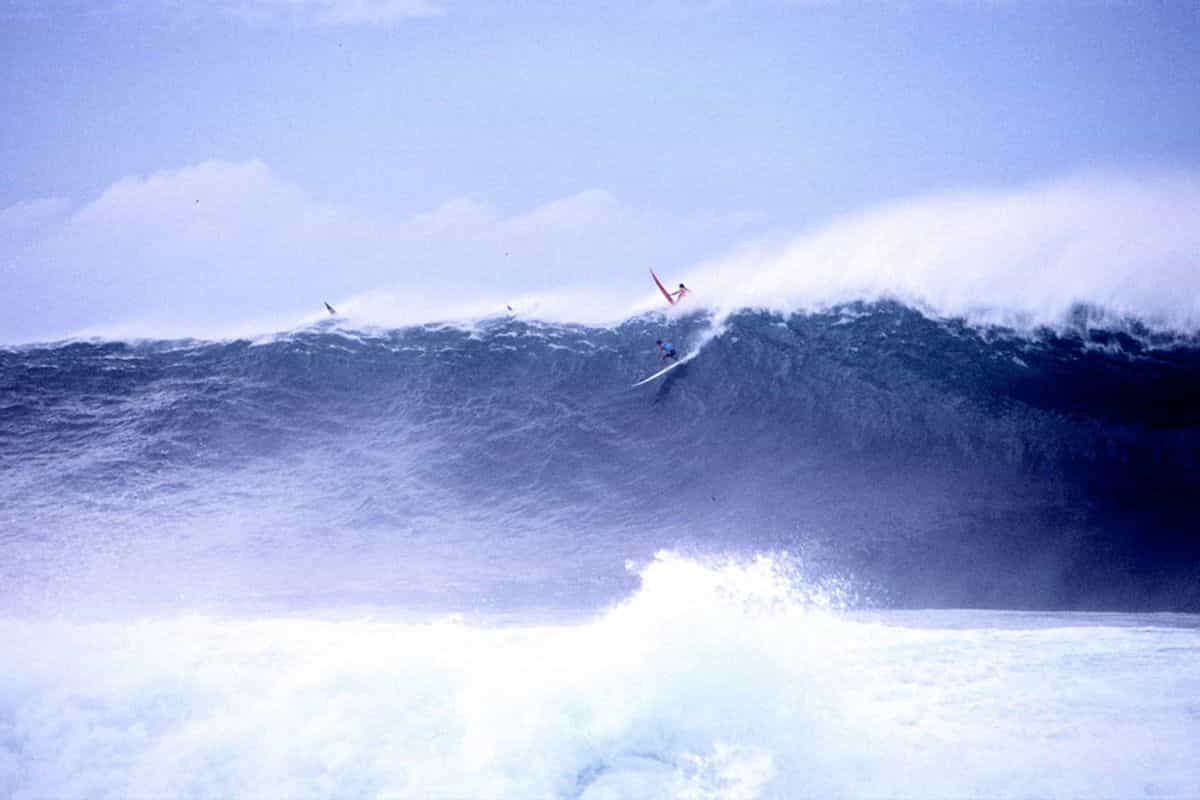Above: Brock Little dropping into Waimea during the 1990 Quiksilver in Memory of Eddie Aikau, photographed by Buzzy Kerbox.