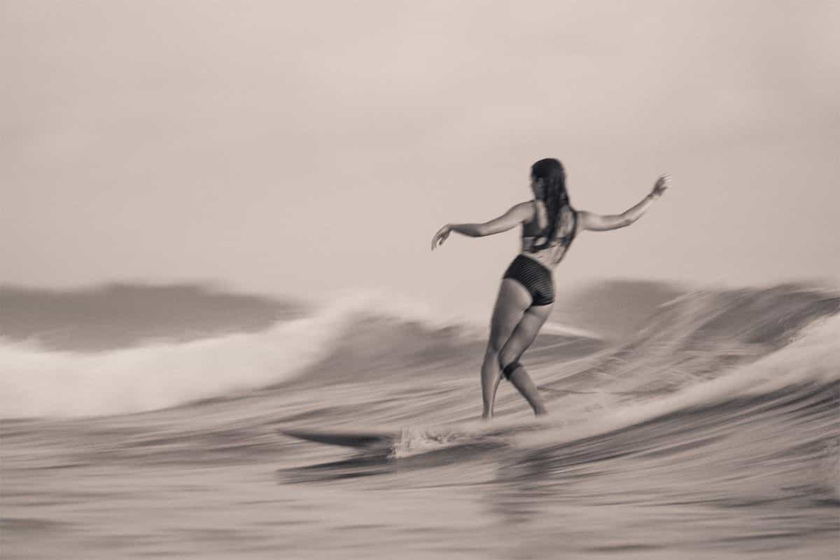 Surf Simply has a small team of photographers and videographers who capture guests’ experiences both in and out of the water over the course of each week. They are rare in the world of surf photography in that they are shooting surf photography full time, five days a week. Photography is a creative calling, however, which means that outside of their ‘day job” each of them also has a personal practice where they explore their art and their interests through the lens of a camera. Marine Jaud is one of Surf Simply’s photographers; her personal photography pushes the possibilities of a camera and water-housing far into the realm of dream-like art, focusing on pastel tones and black and white renderings of ethereal and female-focused surf experiences, or pausing moments of chaos underneath the waves to focus on the beautiful blue bubbles. We thought it high time we share a selection of Marine’s photography and took the opportunity to find out a little more about how she developed as a photographer.