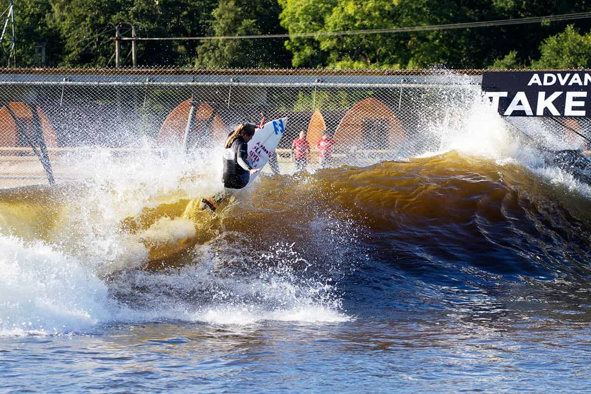 Multiple Welsh and British Women’s champion Jo Dennison hitting the lip of an advanced wave whilst “at work” at Surf Snowdonia.